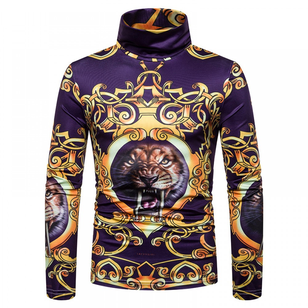 New Men's Large Size 3D Classical Pattern Printing High Neck Long Sleeve T-Shirt Bottoming Shirt